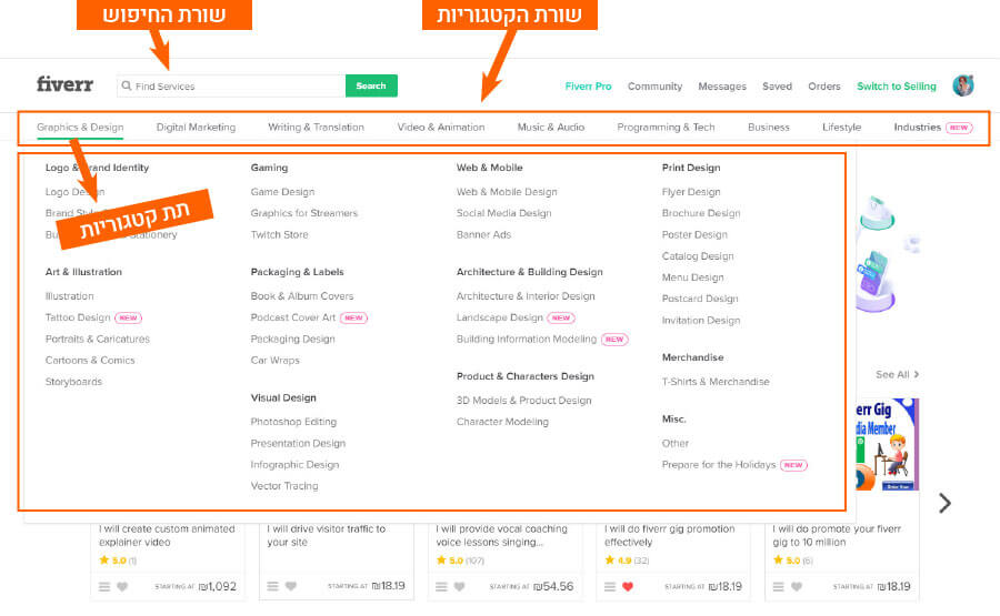 השירותים בפייבר מתחלקים לפי הקטגוריות הבאות: